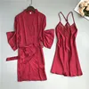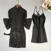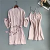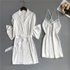 Spring Summer Women Satin Robe & Gown Sets Sexy Lace Sleep Lounge Sleeveless Sil Nightwear Bathrobe+Night Dress Chest Pads