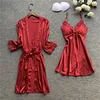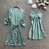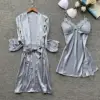 Spring Summer Sexy Women 2 Pieces Satin Robe Gown Sets Sexy Silk Robe Sleeveless Female Sleepwear With Chest Pads Nightwear