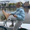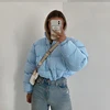 2021 Women Winter Bubble Cropped Jacket Parka New Cute Blue Stand Collar Zipper Cotton Puffer Coat Casual Hem Elastic Outwear