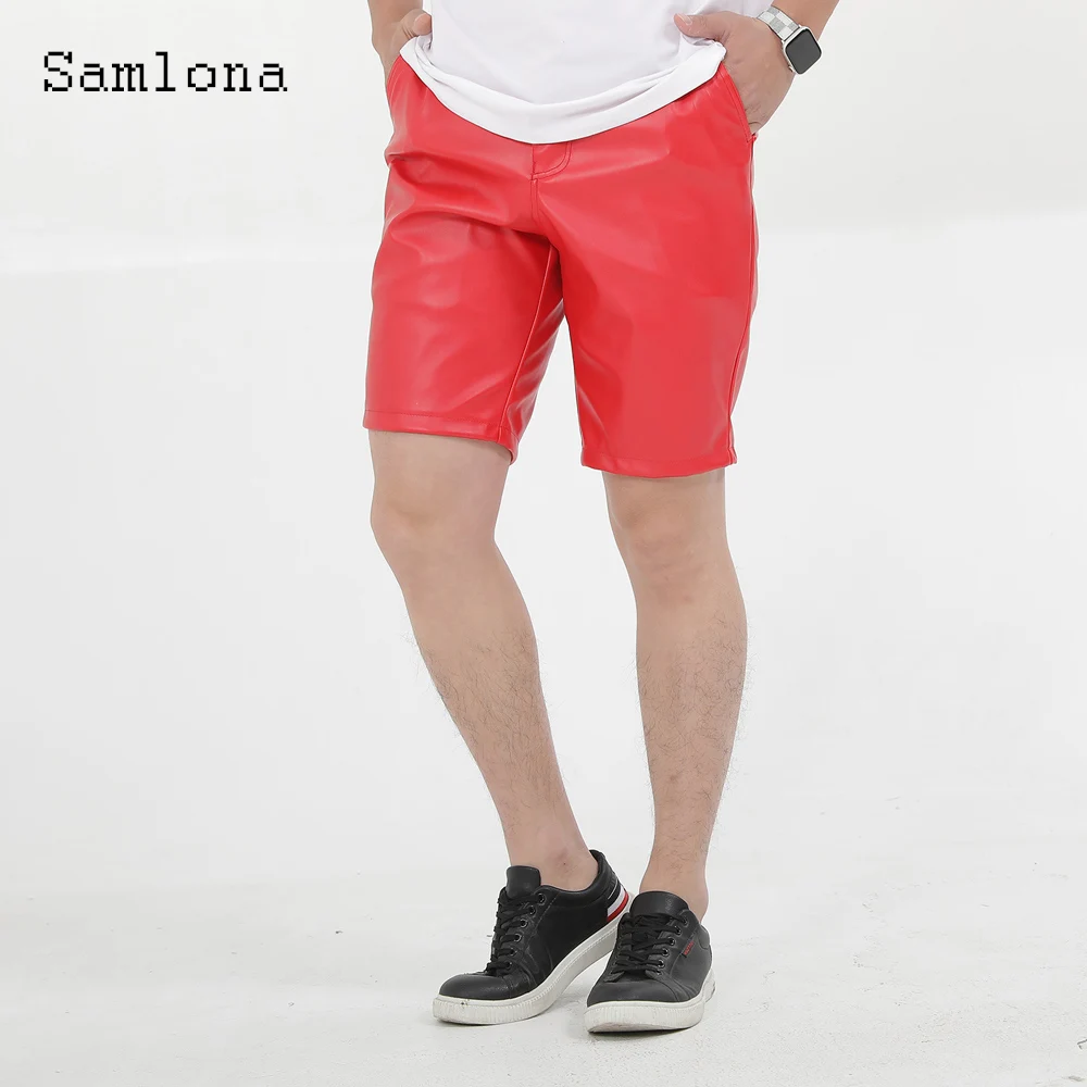 Samlona Plus Size Men's Faxu Pu Leather Shorts Red Khaki Short Pants 2022 Summer New Sexy Fashion Stand Pocket Shorts Homme