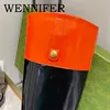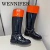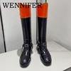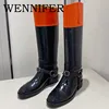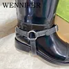 2021 Black Leather Knee Length Women Boots Round Toe Equestrian Buckle Chelsea Boots Hiking Casual Chunky Heels Botas De Mujer