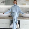 Free Shipping Casual High Neck Long Sleeve Knitted Sweater Set Women's Loose Pullover Knitwear & Flared Pants Two-piece Sets