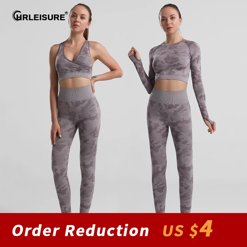 CHRLEISURE 2/3 PCS Seamless High Stretch Camo Print Sports Leggings Set Gym Workout Sportswear High Waist Leggings Sports Suits