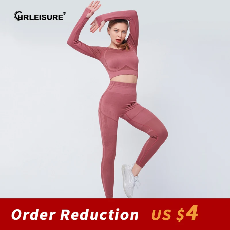 CHRLEISURE Fitness Sports Suit Women Seamless Long Sleeve Set Crop Top Leggings Tracksuit Women Workout Gym Clothing Sportswear