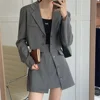 Grey Two Pieces Sets Lady Blazers Coats Plus Size 2021 Chic Elegant Autumn Streetwear Slim New High Waist Mini Skirt