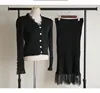 New Winter Knitted Two Piece Set Korean Women V Neck Sweater Cardigan + Bodycon Lace Patchwork Knit Pleated Midi Skirts Suit