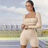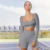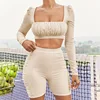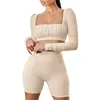 Casual Shorts Suit Sexy Ruched Two Pieces Set Long Sleeve Square Collar Tops Woman Tracksuit 2021 Outfits