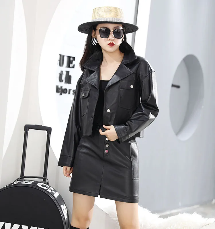Spring Autumn Chic Women's Suits High Quality Genuine Leather Jackets+A-line Skirts Tow Piece Set C703