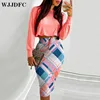 WJJDFC Autumn Women Casual Two Piece Dress Suit Sets Geometric Print Long Sleeve Top & Drawstring Shirred Skinny Skirt Set 2022