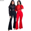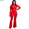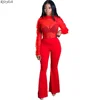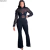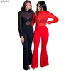 RStylish Women Sets Solid Mesh See-through Full Sleeve Ruffles Tops Flare Pants Two Piece Set Sexy Outfit