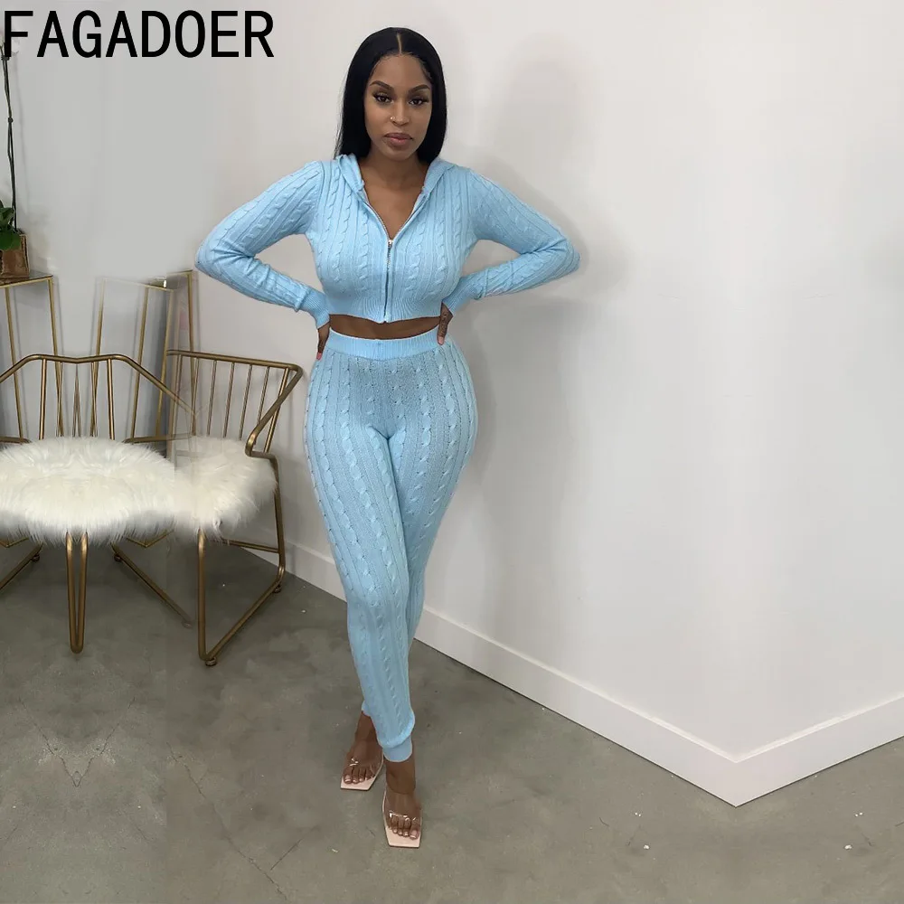 FAGADOER Solid Hoody Knitted Two Piece Women Zipper Hoodies Crop Coat+Skinny Pants Tracksuits Female Casual Home Clothes Outfits