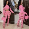 Wishyear 2022 Sexy Fashion Pink Tracksuit Two Piece Set Women Streetwear Cutout Sweatpants and Crop Top Hoodies Sportswear