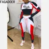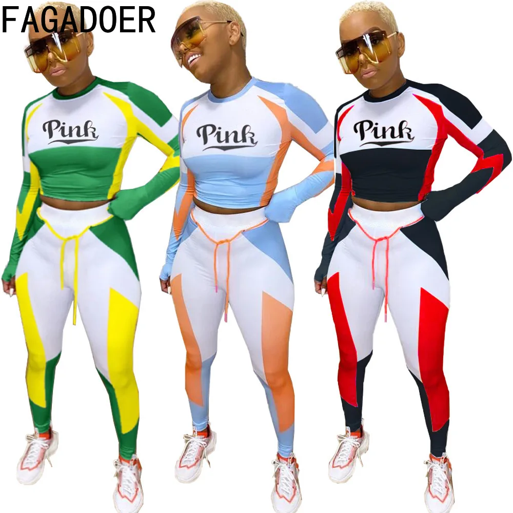 FAGADOER Fitness Patchwork Color Two Piece Set Women PINK Letter Print Top And Legging Pants Tracksuit Sexy Bodycon Outfits 2022
