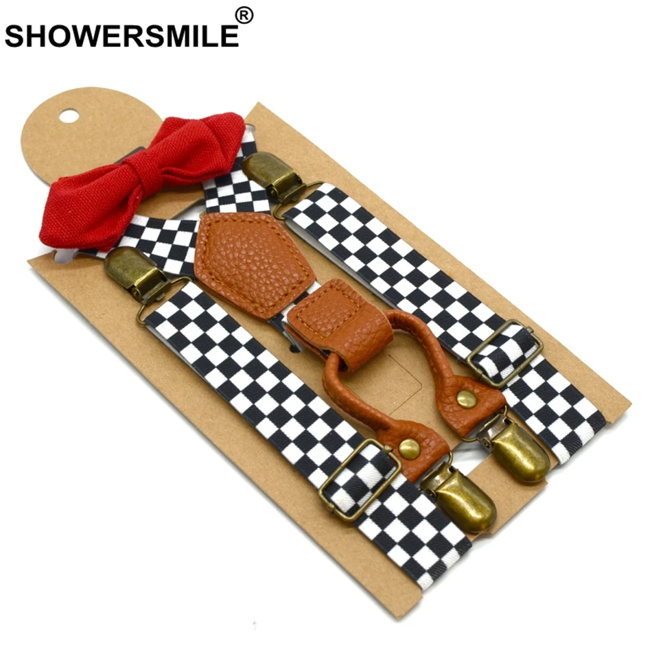Checkered Suspenders Boys Formal Designer Suspenders Bow Tie Children 4 Clips Adjustable Kids Braces Leather Deco