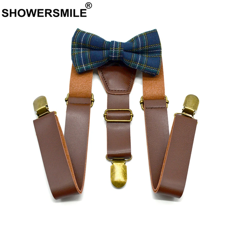 SHOWERSMILE Kids Suspenders With Bow Tie Leather British Style Boys Suspenders Vintage Wedding Brown Children Braces 75cm*2.5cm