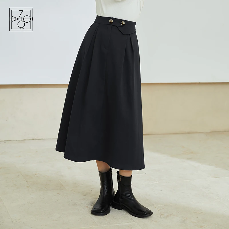 ZIQIAO Women's Winter Thicken Slim Black Skirt Waist Button Decoration A-line Pleated Umbrella Skirt Women юбка миди черная
