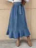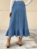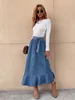 SRUBY Ruffle Hem Belted Denim Skirt Summer Casual Retro Blue Jean Skirts High Waist Loose Hem Girlish Denim Skirts Patchwork
