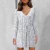 JAYCOSIN Long Sleeve V-neck Spring Summer Bodycon Dress Casual Sundress Fashion Print Pockets Drawstring Elegant Short Dress