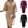 Women Dress Fall Casual Slim Solid Color Dresses New Hollow Out Crisscross V-Neck Long Lantern Sleeve Sexy Party Dress