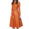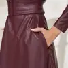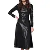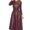 Women Dresses 2021 Autumn Winter Faux Leather Long Sleeve Slim Fit PU Dress Elegant O Neck Large Hem Dress for Daily Wear
