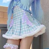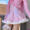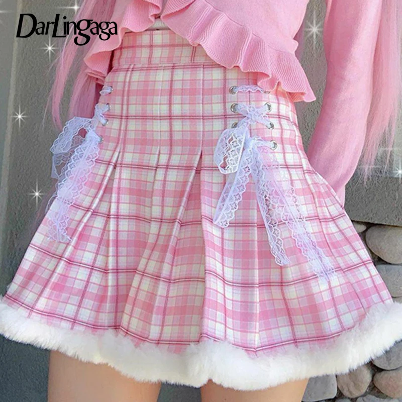 Darlingaga Harajuku Korean Pink Plaid Faux Fur Trim High Waist Mini Skirts Cute Preppy Lace Up Pleated Skirt Women Kawaii Bottom