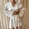 White Elegant Satin 2 Two Piece Set Women Lantern Long Sleeves Crop Tops Cardigan Sexy High Waist Mini Tennis Sports Skirts 2021
