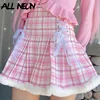 ALLNeon Harajuku 2000s Aesthetics Feather Trim Pink Plaid Skirts Pastel Goth Y2K Lace Bandage High Waist Pleated Skirt Kawaii