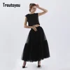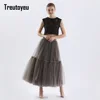 Treutoyeu Vintage Gothic Black White Pleated Long Tulle Skirt Tutu Femme High Waisted Runway Soft Mesh Skirts Womens 2021 Jupe