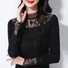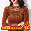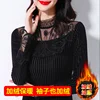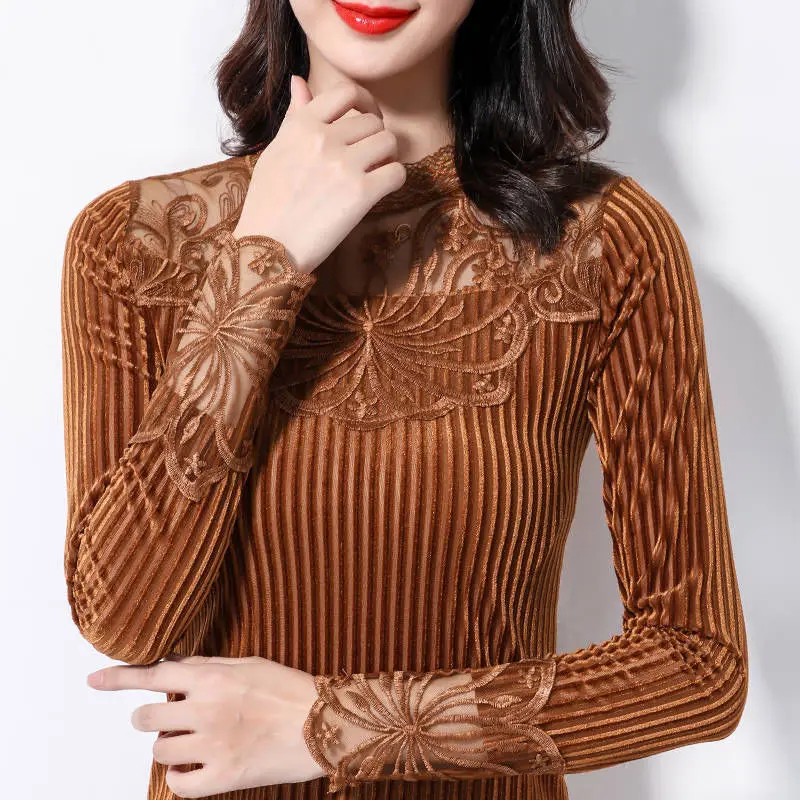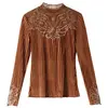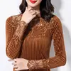 Camisa de fondo de terciopelo dorado para mujer, blusa hueca de manga larga con bordado de encaje, talla grande 5XL, otoño e invierno, 2020