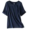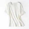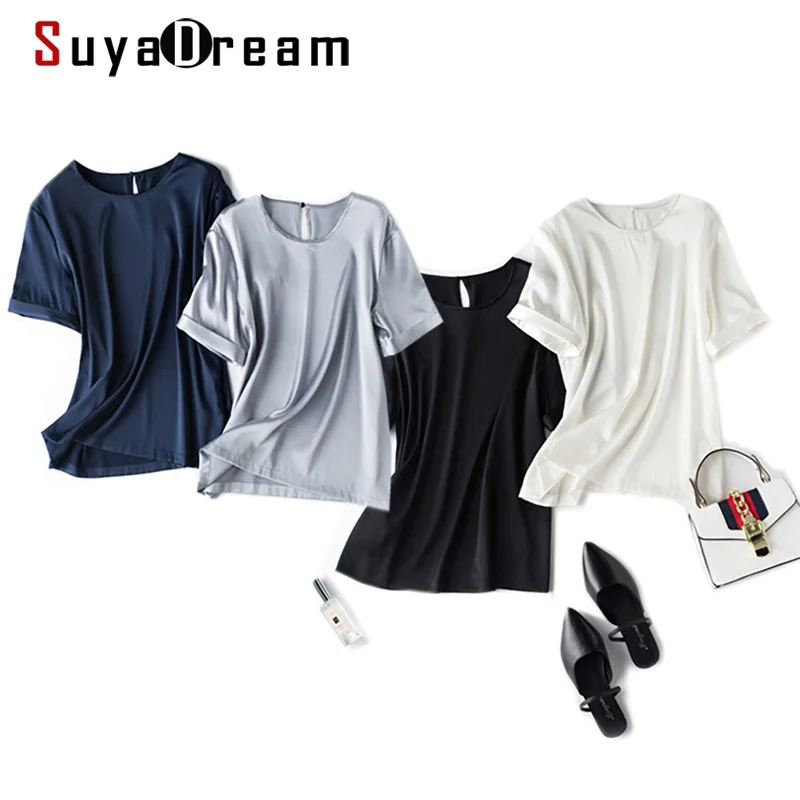 SuyaDream Blusa lisa de satén para mujer, camisa de manga corta con cuello redondo, 95% de seda 5% Spandex, Top de seda azul marino 2021