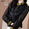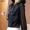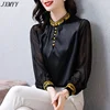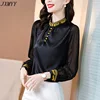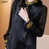 JXMYYY camisa de seda satinada de manga larga para mujer, blusa retro bordada con cuello levantado, color negro, Primavera, 2021