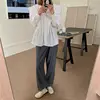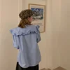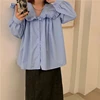 QWEEK Blusa Kawaii con manga farol para mujer, camisa con volantes y cuello Peter Pan, camisa azul de oficina de algodón de estilo coreano