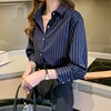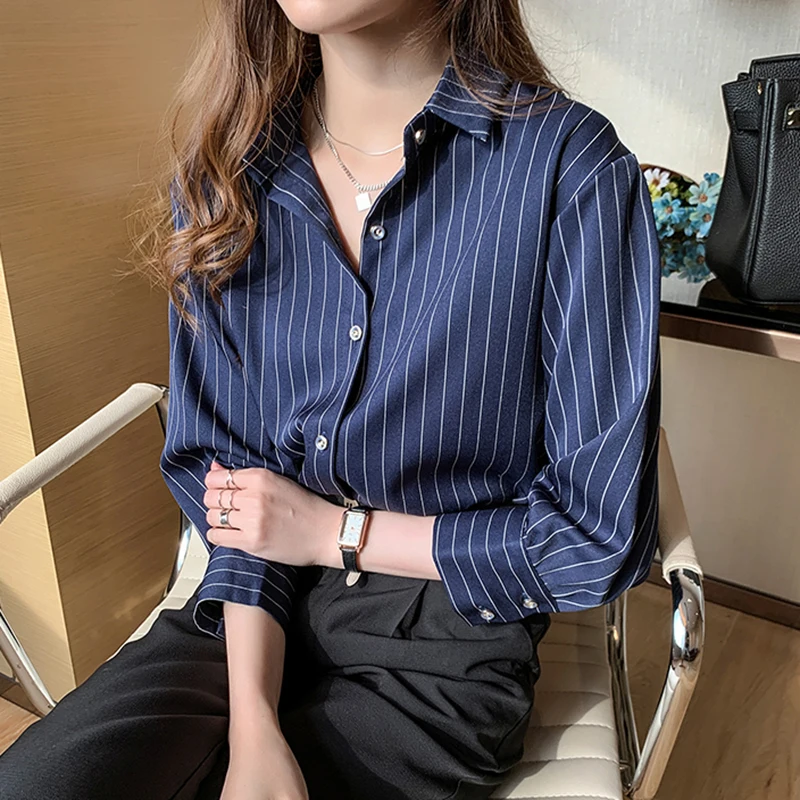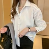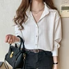Blusa blanca a rayas de tres cuartos para mujer, Camisa de gasa de manga larga con botones, ropa para oficina, Otoño, 2022