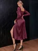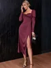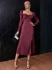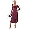 Srubí Vestido de manga larga con cuello cuadrado, con cremallera, sin tirantes, cintura burbuja, falda media y larga, abertura alta, navidad