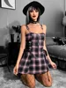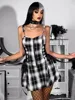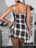 Srubí vestido Sexy a cuadros, con tirantes finos, cremallera, con cordones, ajustado, fruncido, de cintura alta, costura, Espalda descubierta, para Club nocturno de otoño