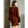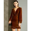 Vestido de terciopelo de seda para mujer, minivestido con escote en V, manga larga farol, pliegues, volantes en cascada, monocolor, 100%
