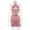 Vestido ajustado de satén de alta calidad para mujer, conjunto de 2 piezas, vestido de fiesta rosa con cuello Halter, vestido Sexy de celebridad para Club nocturno, 2022