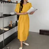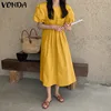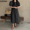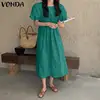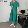 VONDA Vestido holgado informal de verano para mujer, traje plisado de manga corta abombada con cuello redondo, Vestido de fiesta de media pantorrilla, de gran tamaño