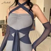 Macheda Vestido corto ceñido con cuello Halter para mujer, vestido informal de punto, con encaje azul, 2020