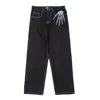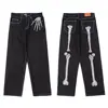Ropa de calle oscura para hombres, pantalones vaqueros con bordado de esqueleto Punk negro, Hip Hop, rectos, informales, anchos, Capris, 2021