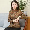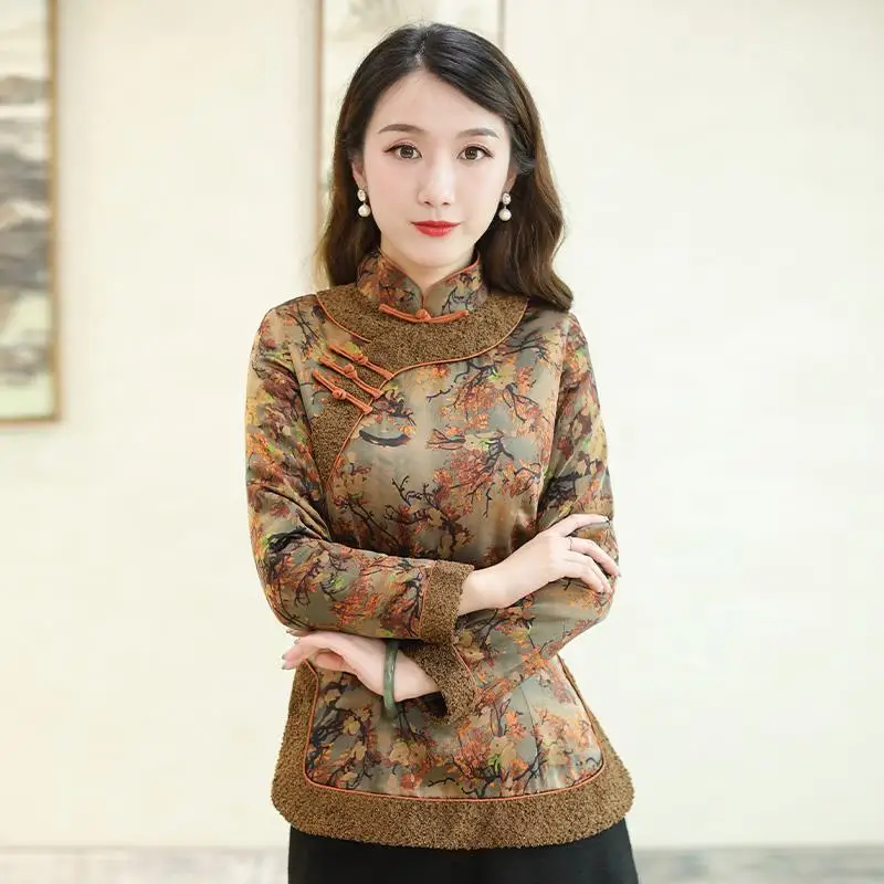 Cheongsam Tops de talla grande para mujer, camisas ajustadas Retro de mezcla de algodón con estampados de empalme, estilo chino grueso, invierno, 2021