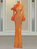 LORIE 2021 Vestidos de Noche de lentejuelas, naranja, manga larga, con plumas, para fiesta de graduación, longitud hasta el suelo, de celebridades, talla grande