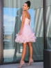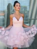 SoDigne Vestido corto rosa/Mini para baile de graduación, vestido sencillo con tirantes finos, flor hecha a mano, sin mangas, vestido Formal de Graduación
