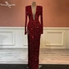 Vestido De Fiesta rojo De sirena, manga larga, lentejuelas, abertura alta, cuello en V profundo, Sexy, Formal
