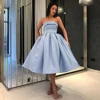 Vestidos De baile De graduación De tafetán azul sin tirantes para mujer, vestido De fiesta Formal largo hasta el té, línea A, bata De Soriee personalizada sin mangas