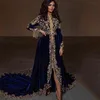 Caftán marroquí azul, caftán musulmán de noche, línea A, mangas largas, apliques de terciopelo, Dubái, árabe, turco, Abaya, vestido islámico