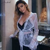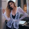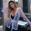 Macheda Camiseta Sexy transparente para mujer, Top informal ajustado de manga larga de encaje blanco con cuello en V, ropa de mujer, camiseta lisa, novedad de otoño