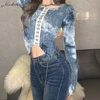 Macheda Camiseta de manga larga de estilo teñido azul, Top corto con diseño único de dobladillo y cola de golondrina, moda urbana, Otoño, nueva