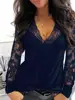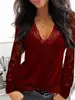 Camiseta Sexy de encaje para mujer, remera ahuecada con cuello en V, Tops transparentes de manga larga, camisetas Vintage de moda para mujer de primavera y otoño