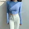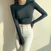 Camisetas básicas elásticas de manga larga para mujer, Top corto informal en blanco y negro, camiseta azul, camisetas ajustadas coreanas para mujer 2022